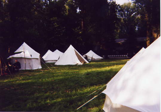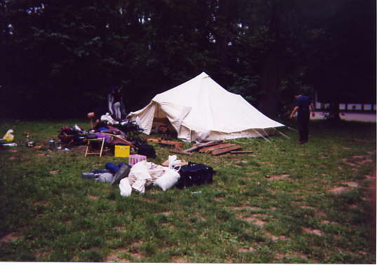 Abend. Mein Zelt (mit Schild) steht und so langsam nimmt das Lager Gestalt an.